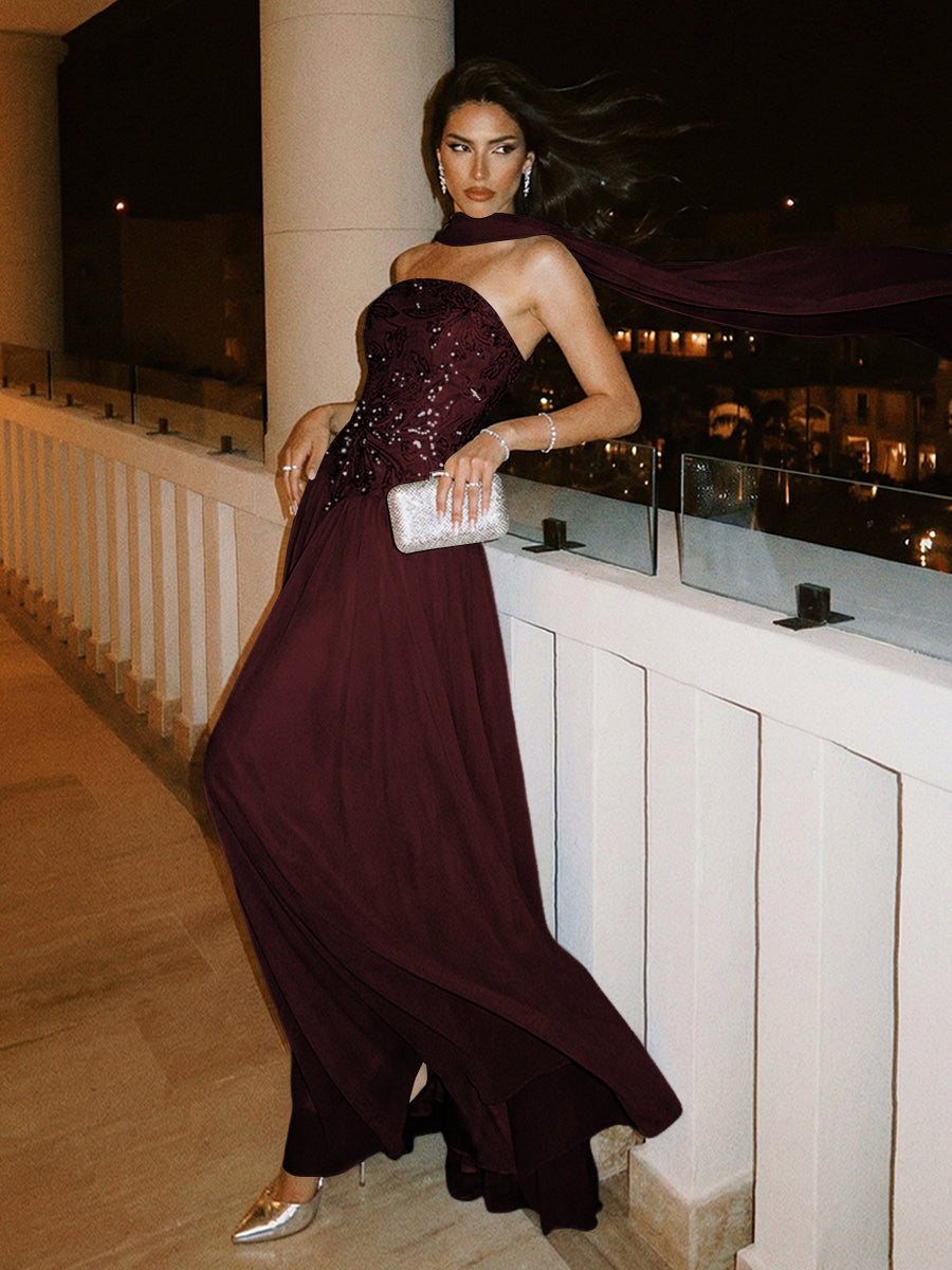 YES1150089 Strapless A Line Sequin Evening Dresses with Scarf