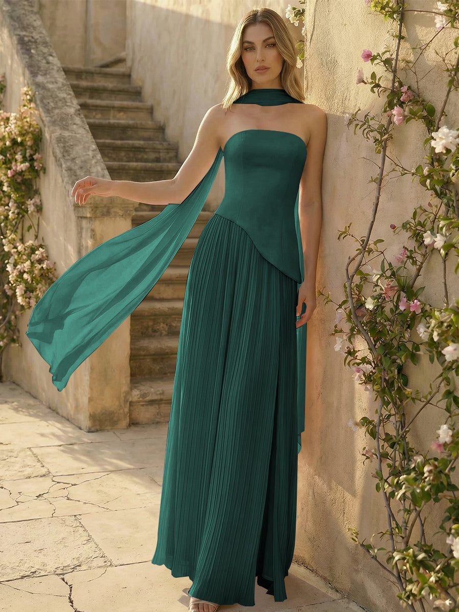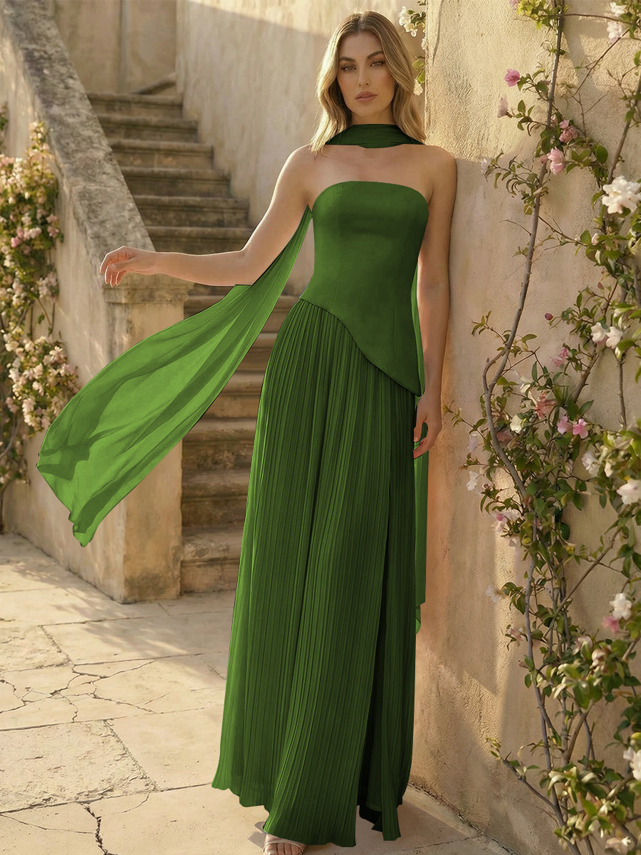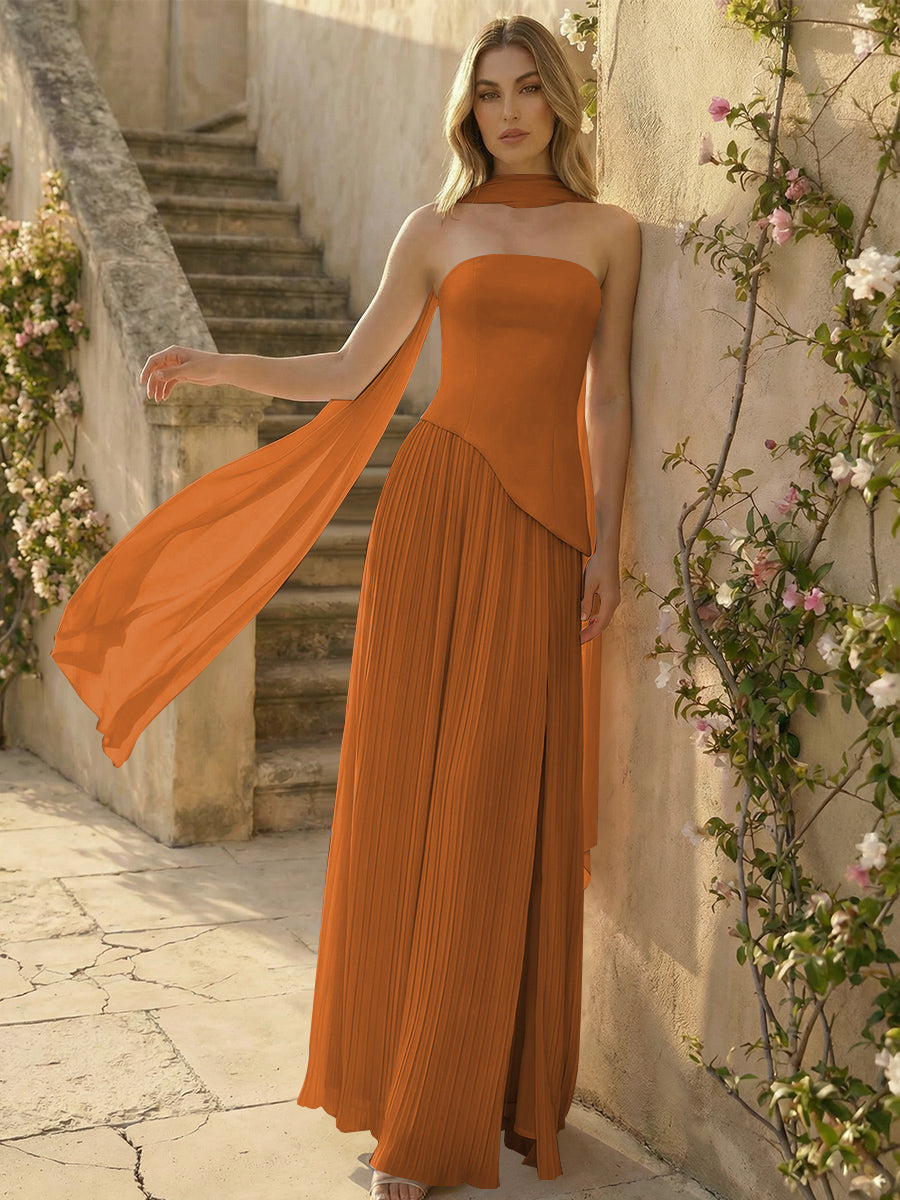 • Chiffon Strapless Pleated High Slit A Line Bridesmaid Dresses with Scarf