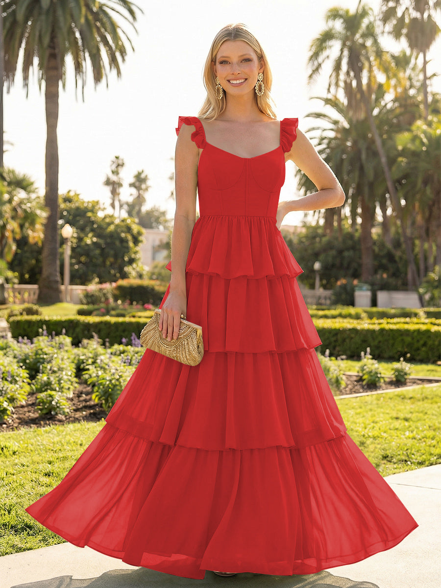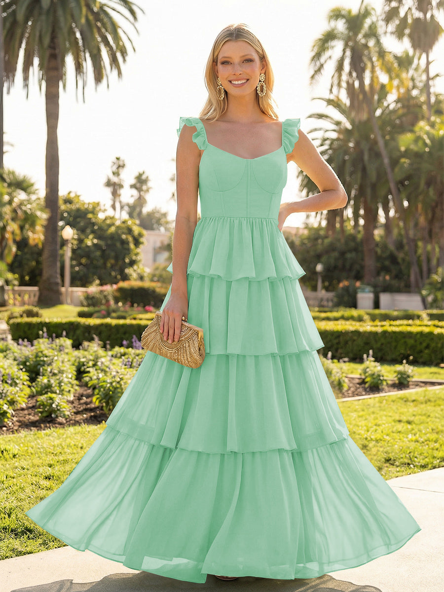 A Line Sleeveless Pleated Chiffon Spaghetti Straps Ruffles Bridesmaid Dresses