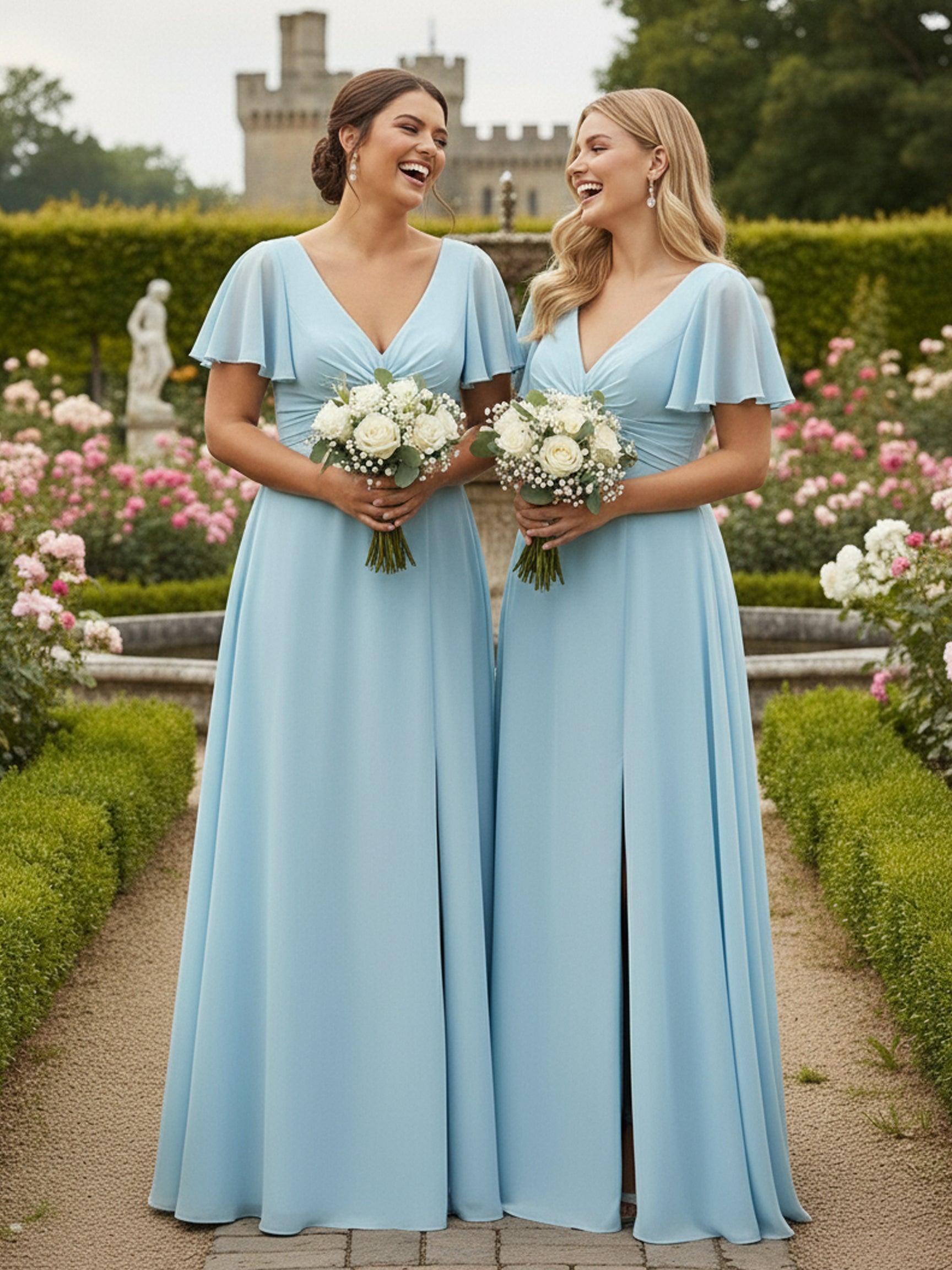 A Line V Neck Short Sleeves Bow Bridesmaid Dresses with Slit