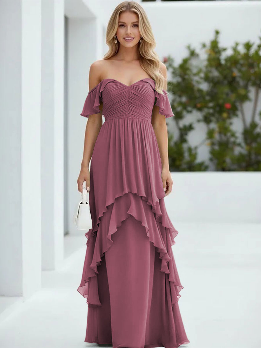 Chiffon Off the Shoulder Pleated Tiered Bridesmaid Dresses