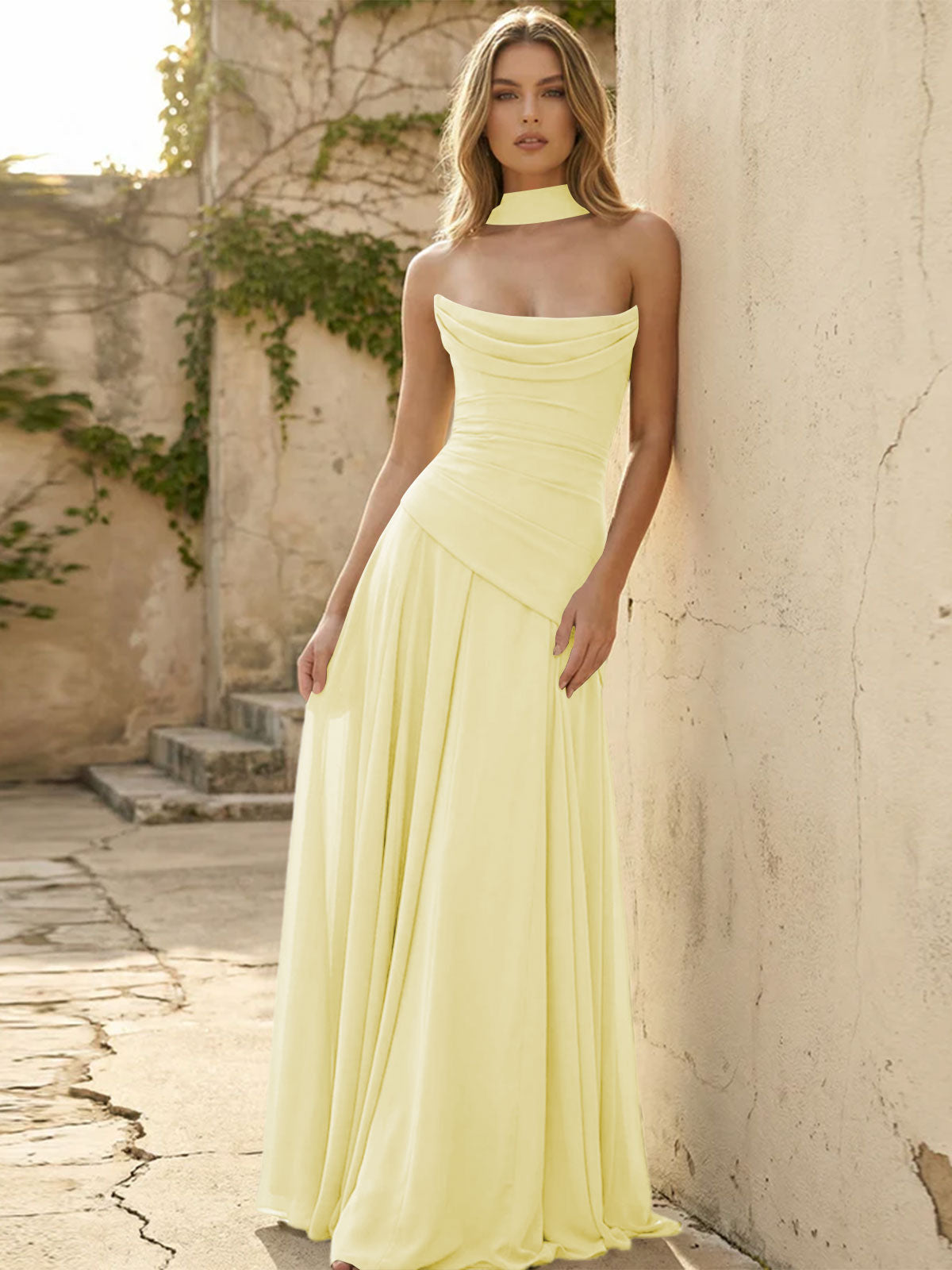 Chiffon Strapless Pleated A Line Bridesmaid Dresses with Scarf