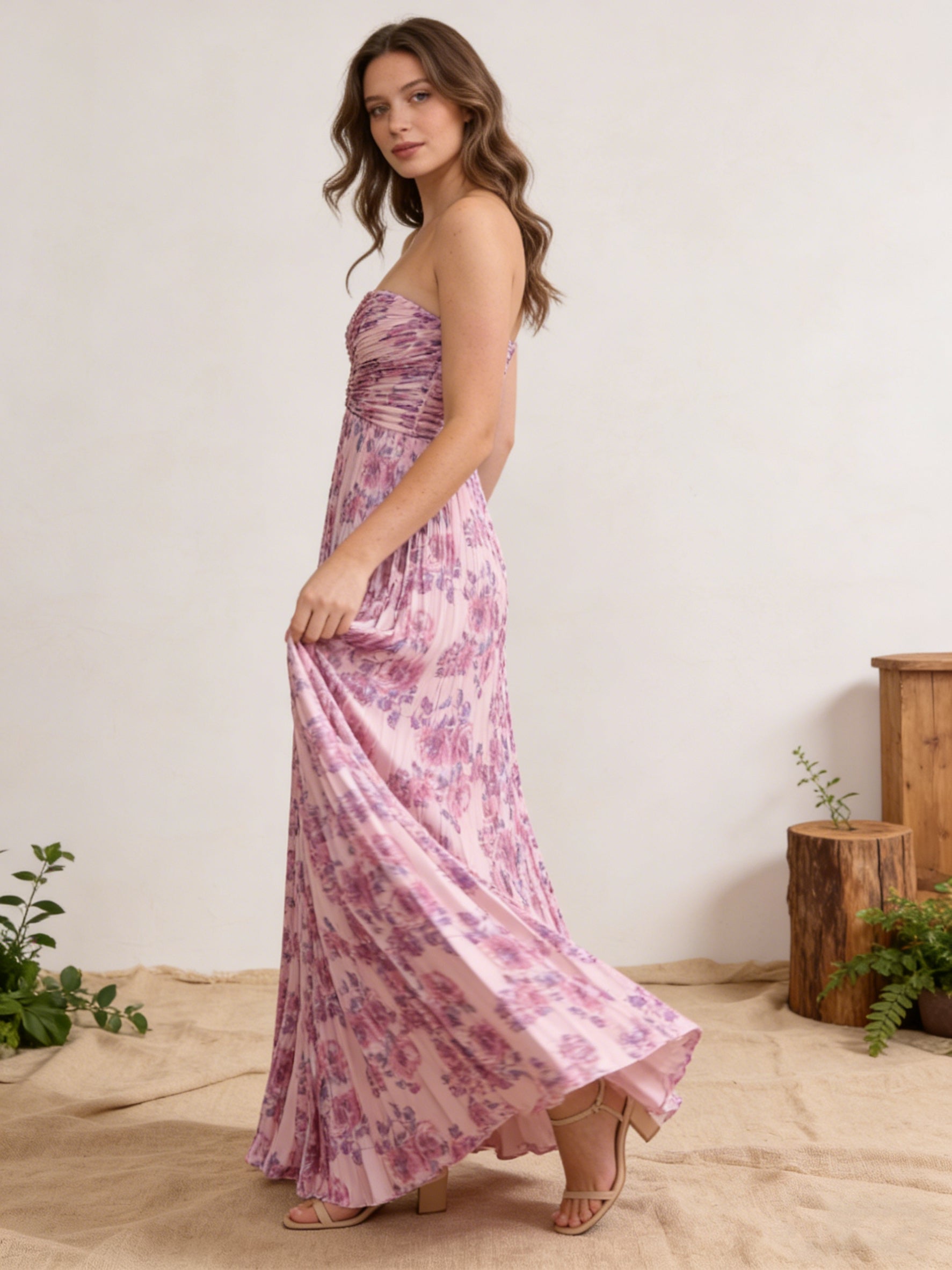 Chiffon Strapless Pleated Maxi Wedding Guest Dresses with Floral