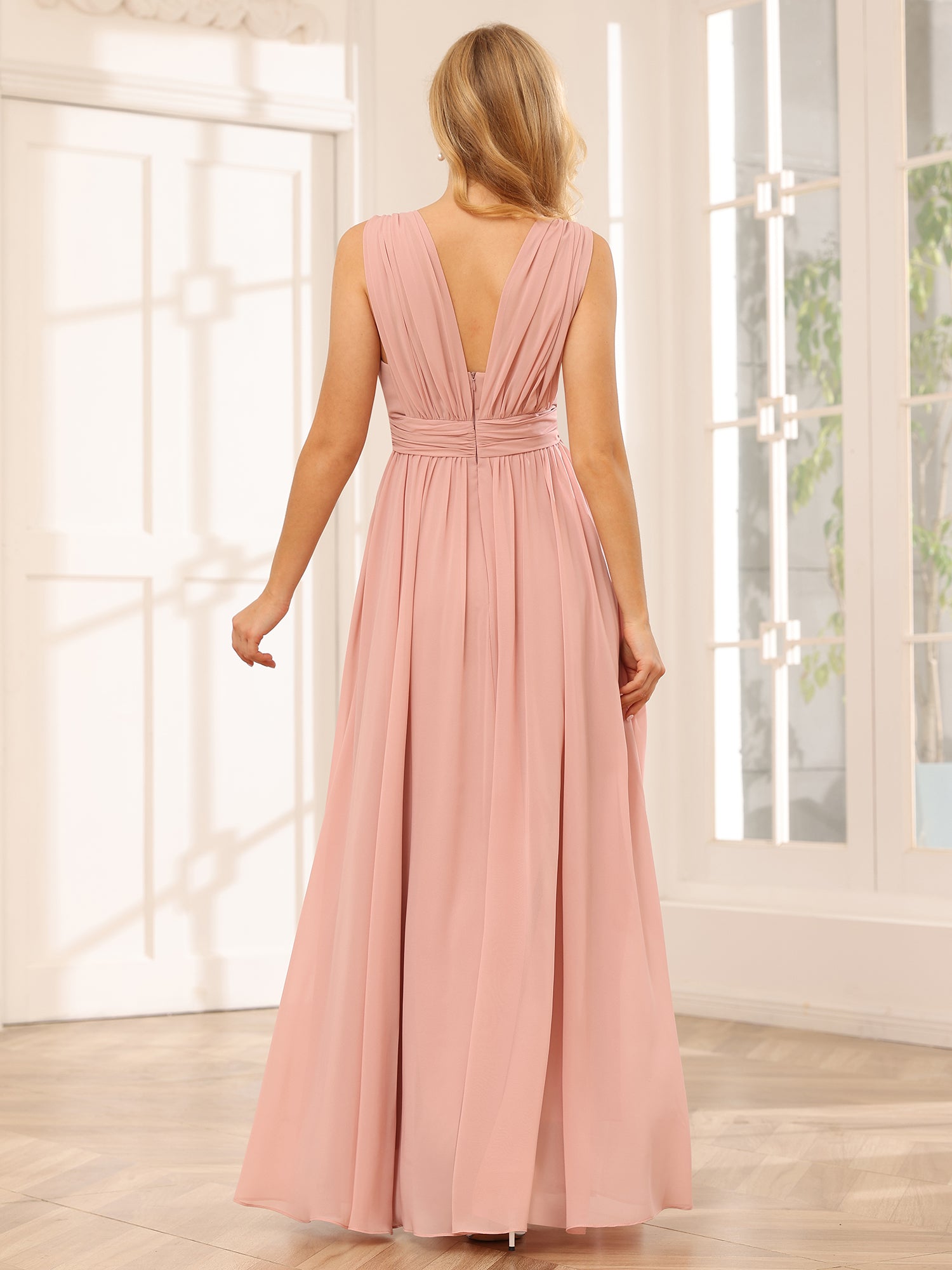 Chiffon V Neck A Line Pleated Bridesmaid Dresses with Slit