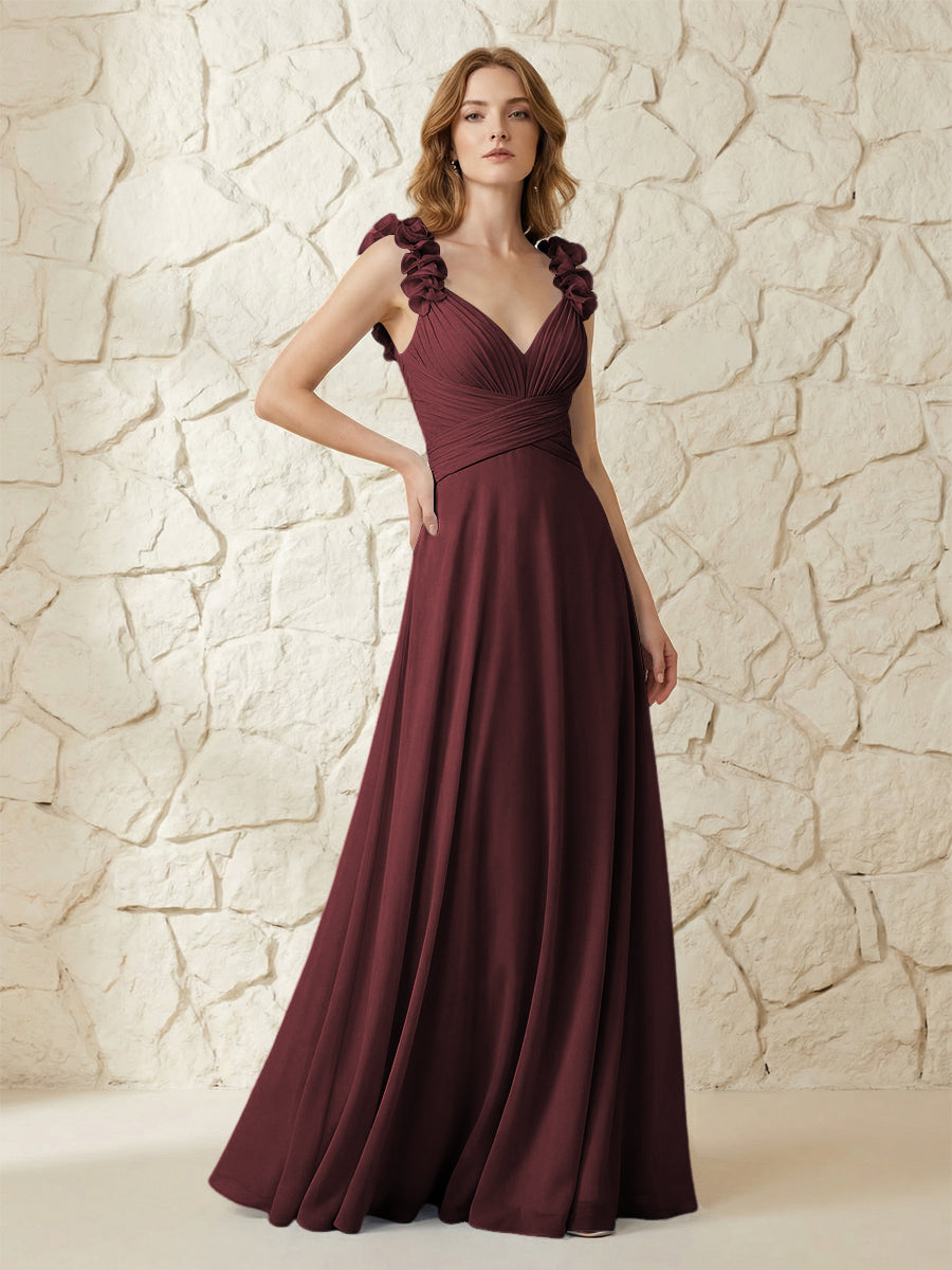 Chiffon V Neck Pleated Corset Bridesmaid Dresses with 3D Flower