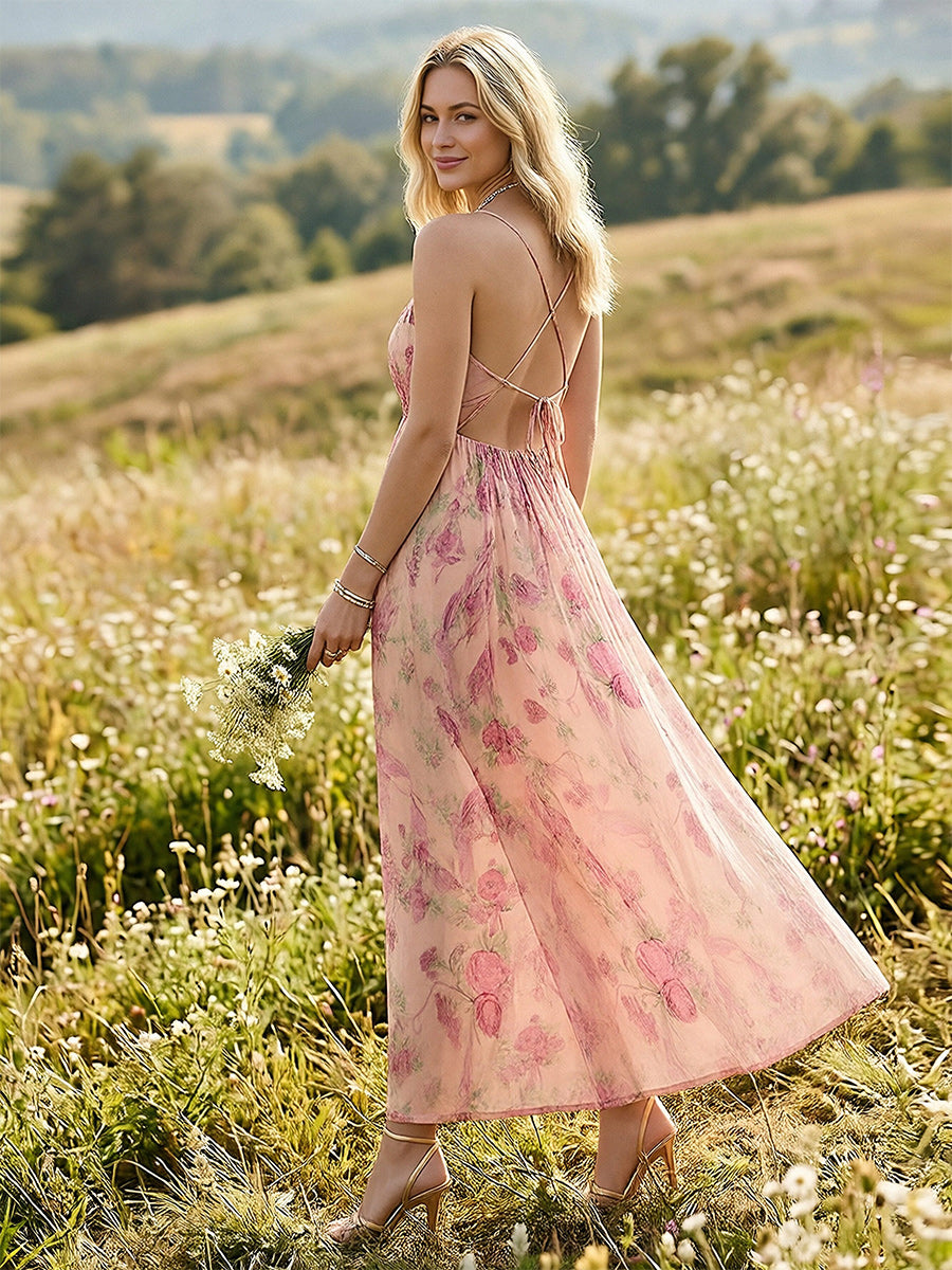 Floral V Neck Spaghetti Straps Maxi Dresses
