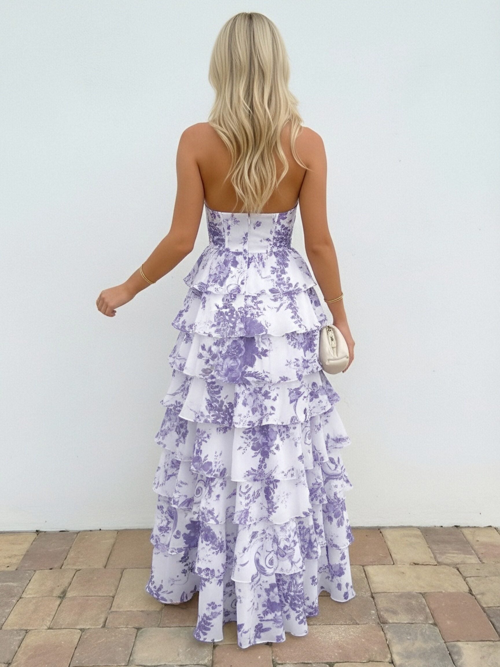 Halter Floral Deep V Neck A-Line Prom Dresses with Layered