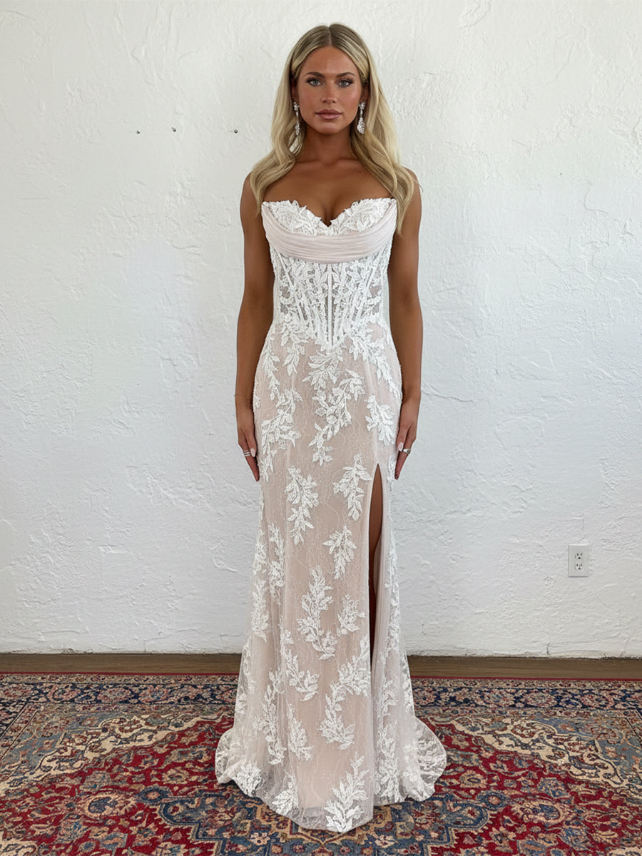Lace Applique Strapless Sheath Cowl Neck Prom Dresses with Slit