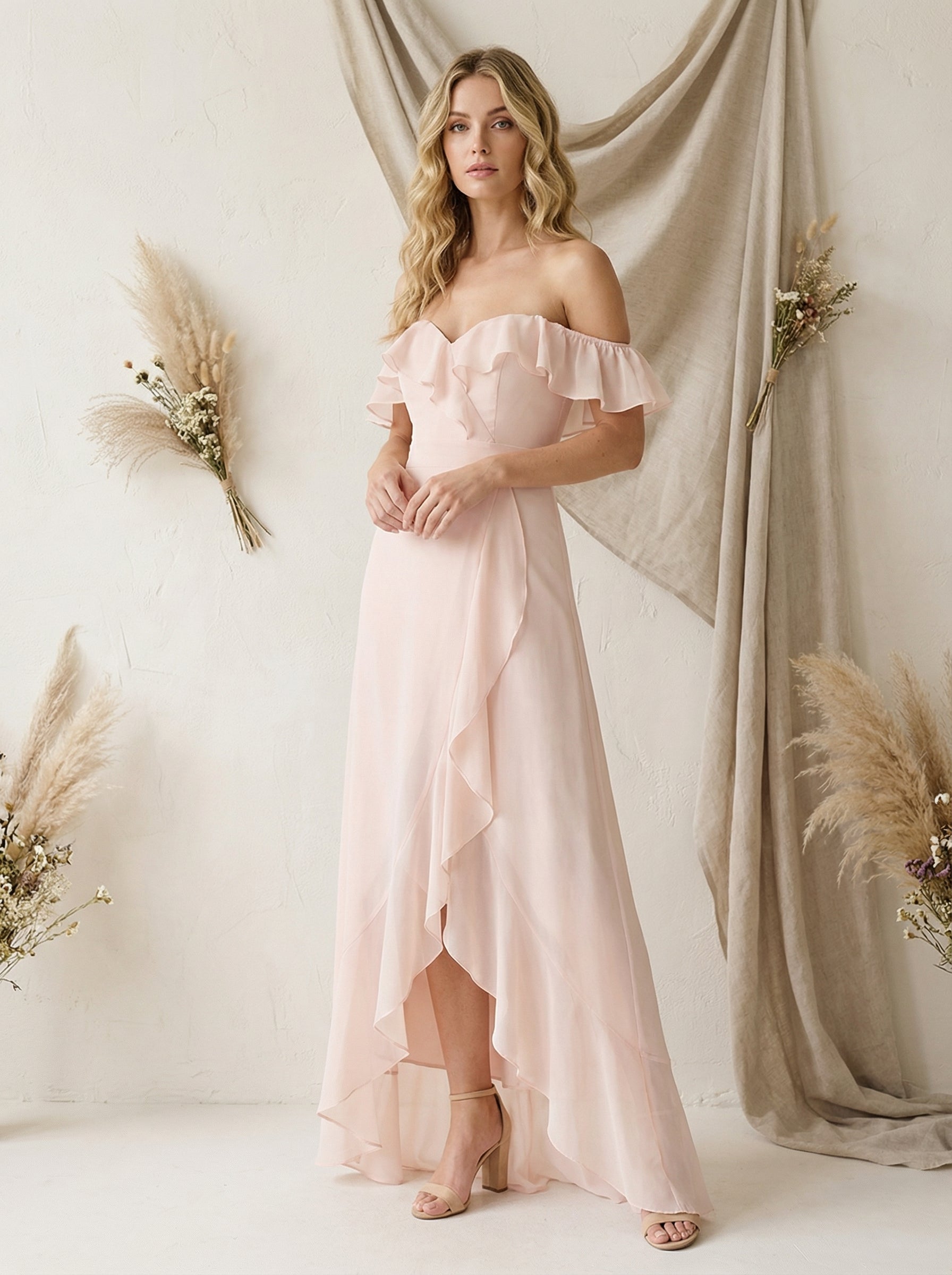 Ruffles Chiffon Off Shoulder Maxi Bridesmaid Dresses with Slit
